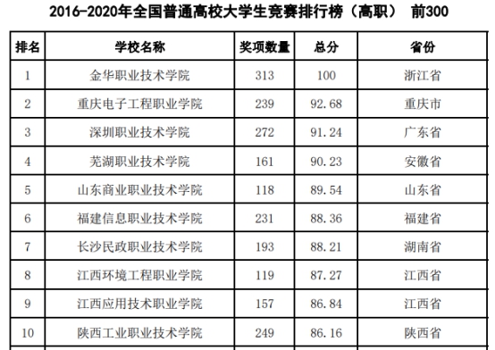 在高职院校榜单中,芜湖职业技术学院名列前茅。在《2020年全国普通高校大学生竞赛排行榜(高职)前100》榜单中,我校以总分95.96,位居全国第四位,安徽省第一名;在《2016-2020年全国普通高校大学生竞赛排行榜(高职)前300》榜单中,我校以总分90.23,位居全国第四位,安徽省第一名;在《2016-2020年中部地区高职院校大学生竞赛排行榜前20》榜单中,我校独占鳌头。