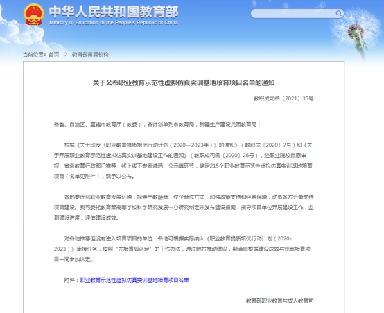 “职业教育示范性虚拟仿真实训基地培育项目”是教育部职成司贯彻落实《职业教育提质培优行动计划(2020—2023年)》(教职成〔2020〕7号)精神的重要举措,通过全国范围内遴选、建设、培育一批优秀的虚拟仿真实训基地项目,深入研究推进传统教学育人手段改革、人才培养模式创新,强化教学、学习、实训相融合的教育教学活动。全国共确定215个职业教育示范性虚拟仿真实训基地培育项目,安徽省此次立项8个项目。