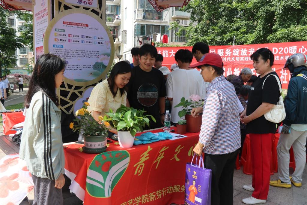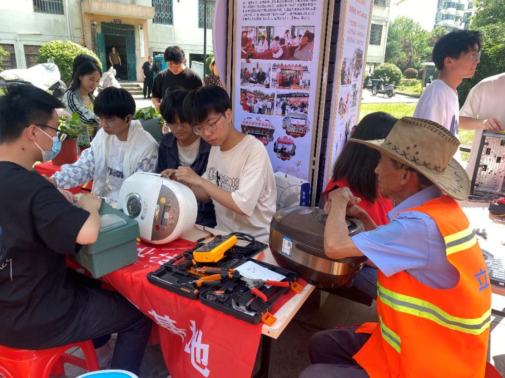 由食品与生物工程学院、园林园艺学院、电气与自动化学院、信息与人工智能学院师生组成的志愿服务队,来到石城湖小区“暖心亭”,开展血压测量与营养健康宣教、文明养宠宣传、绿植花卉养护、家用电器维修、电子产品维护等多项惠民便民服务活动。