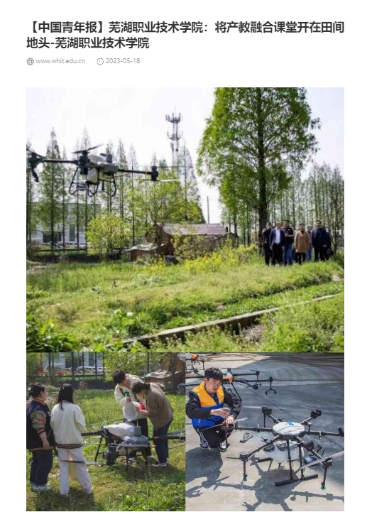职教活动周期间,中国青年报客户端以《芜湖职业技术学院:将产教融合课堂开在田间地头》为题,报道了长期以来我校师生服务基层农业,投身乡村振兴事业,打造农业发展共同体,拓宽乡村振兴新路径,支农扶农,深入开展科技兴农的特色典型案例。展示了我校多年来坚持“以教促产、以产助教、产教融合、产学合作”,构建以学生为主体的“项目实践—创赛培育—项目孵化—成果转化”科研育人机制,创新工学交替、育训并举人才培养模式的改革成果。