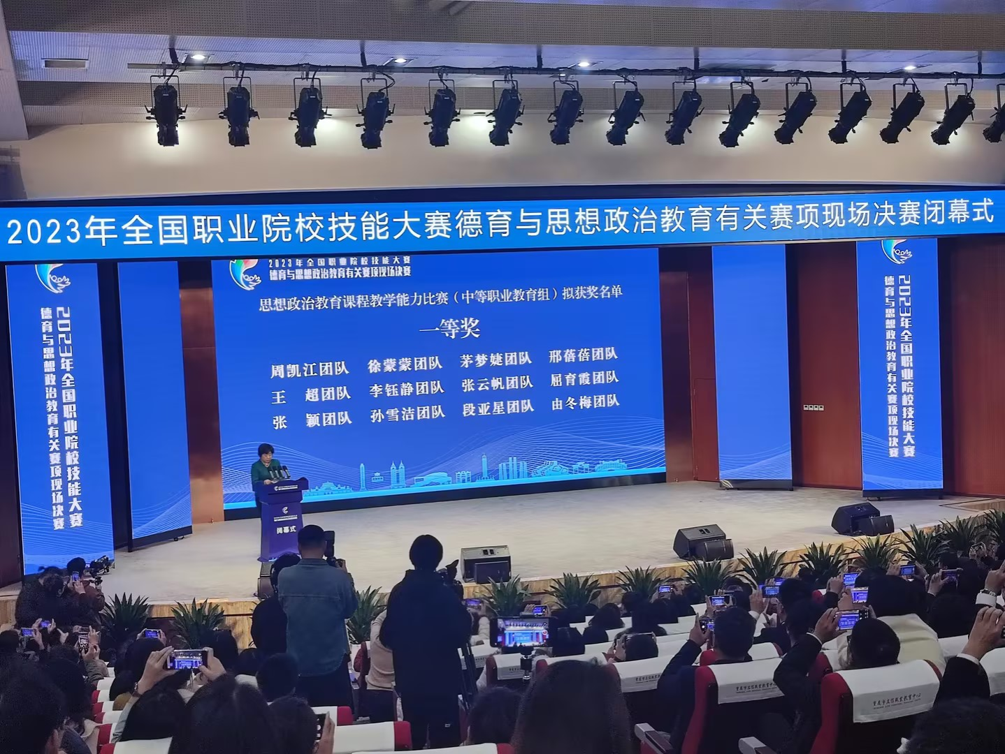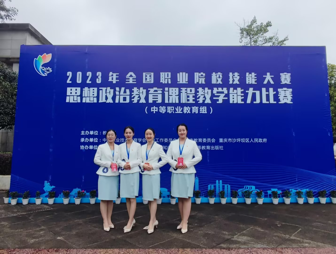 2023年12月2日,由教育部主办,重庆市教育委员会等承办的2023年全国职业院校技能大赛德育与思想政治教育现场决赛思想政治教育课程教学能力比赛(中等职业教育组)在重庆市立信职教中心举行。我校邢蓓蓓、过艳、刘旸、吴素娟教学团队与全国61支参赛队伍展开激烈竞争,最终荣获国赛一等奖。