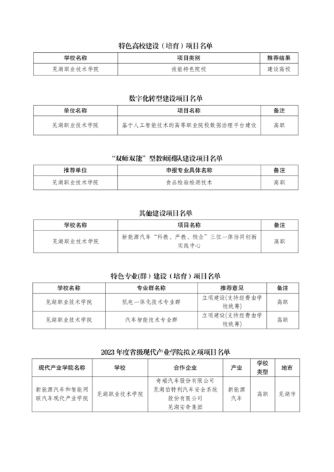 安徽省教育厅日前公布了高校“双特色”建设(培育)项目名单。芜湖职业技术学院入选技能特色院校建设项目,机电一体化技术专业群、汽车智能技术专业群入选特色专业(群)建设项目,新能源汽车和智能网联汽车现代产业学院入选现代产业学院建设项目,基于人工智能技术的高等职业院校数据治理平台建设入选数字化转型建设项目,食品检验检测技术专业团队入选“双师双能”型教师团队建设项目,同时,新能源汽车“科教、产教、校企”三位一体协同创新实践中心喜获立项建设。