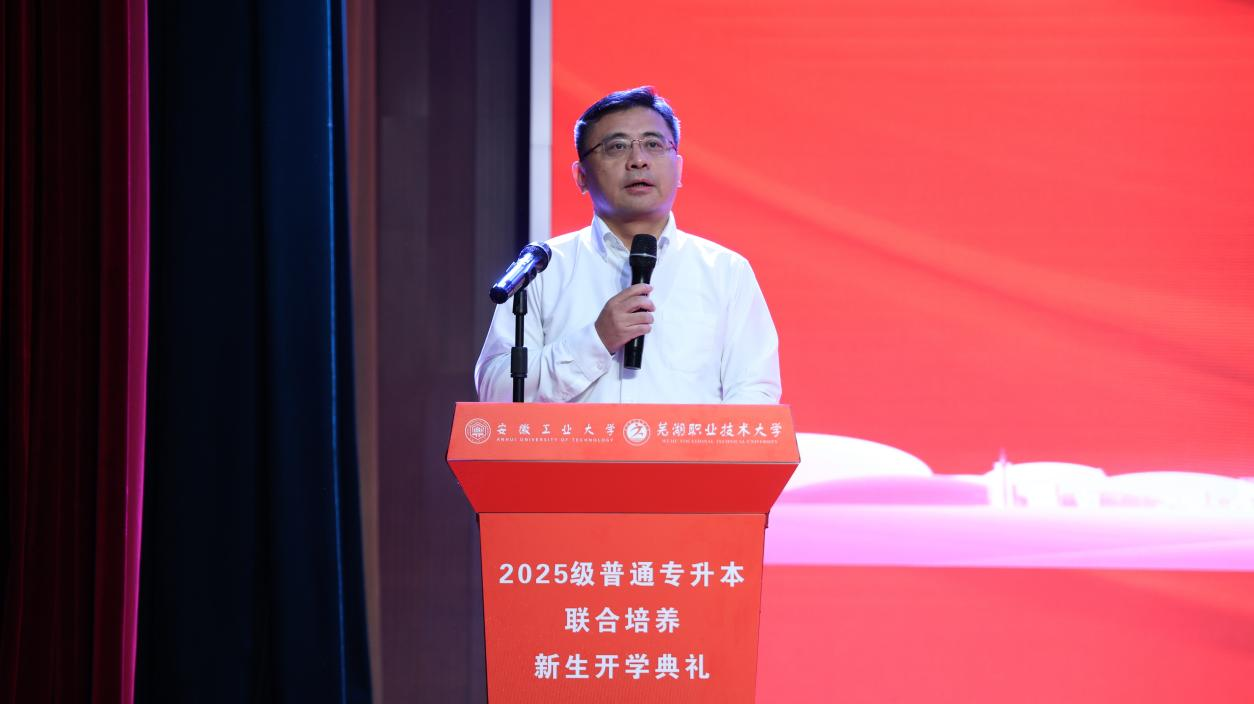 季慕寅代表芜湖职业技术大学致辞。他指出,两校开展本科层次联合培养已走过三年,通过互通优质师资、共享教学资源,深度融合“精工博学、厚德敏行”的工大底蕴与“崇德、尚能、务实、创新”的芜职精神,构建起“理论筑基、技能赋能、实践成才”的协同育人模式,同时,他对新生提出三点希望:铸魂立心以涵养家国情怀;笃学精技以筑牢专业根基;砺行担当以锤炼综合素养。他鼓励同学们走进图书馆汲取知识、走进体育馆强健体魄,在实践中增长才干,感恩致远以传承校脉精神。