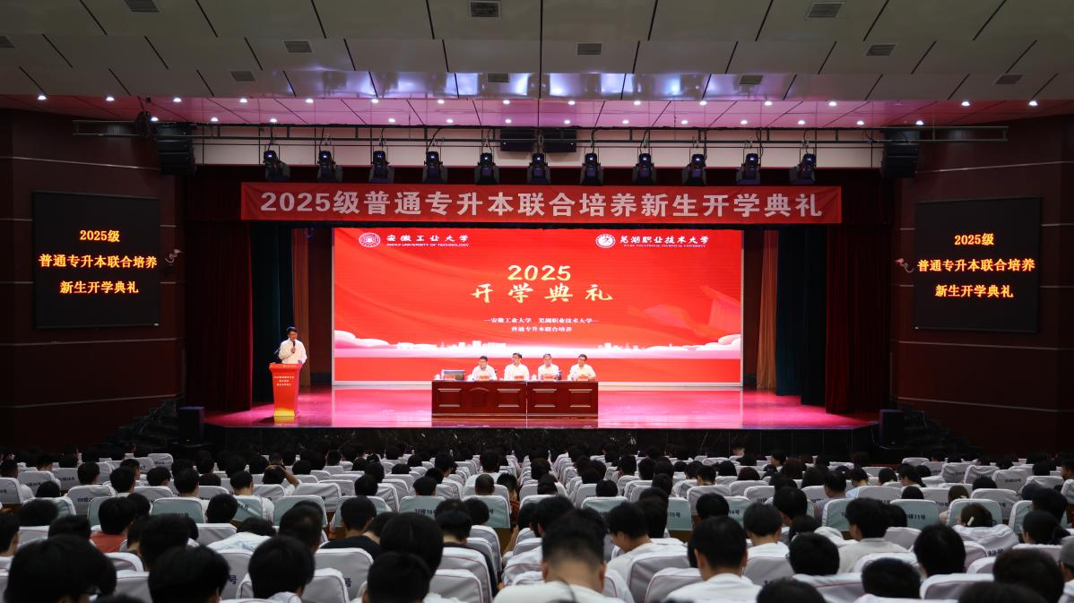 9月23日上午,安徽工业大学与芜湖职业技术大学2025级普通专升本联合培养新生开学典礼在芜湖职业技术大学文津校区大礼堂隆重举行。安徽工业大学副校长郑啸、安徽工业大学学生工作部副部长王萌、教务处副处长曹启定、芜湖职业技术大学行政负责人季慕寅,相关职能部门负责人、相关二级学院党政负责人、教师代表、560名新生及新生辅导员共同出席典礼。