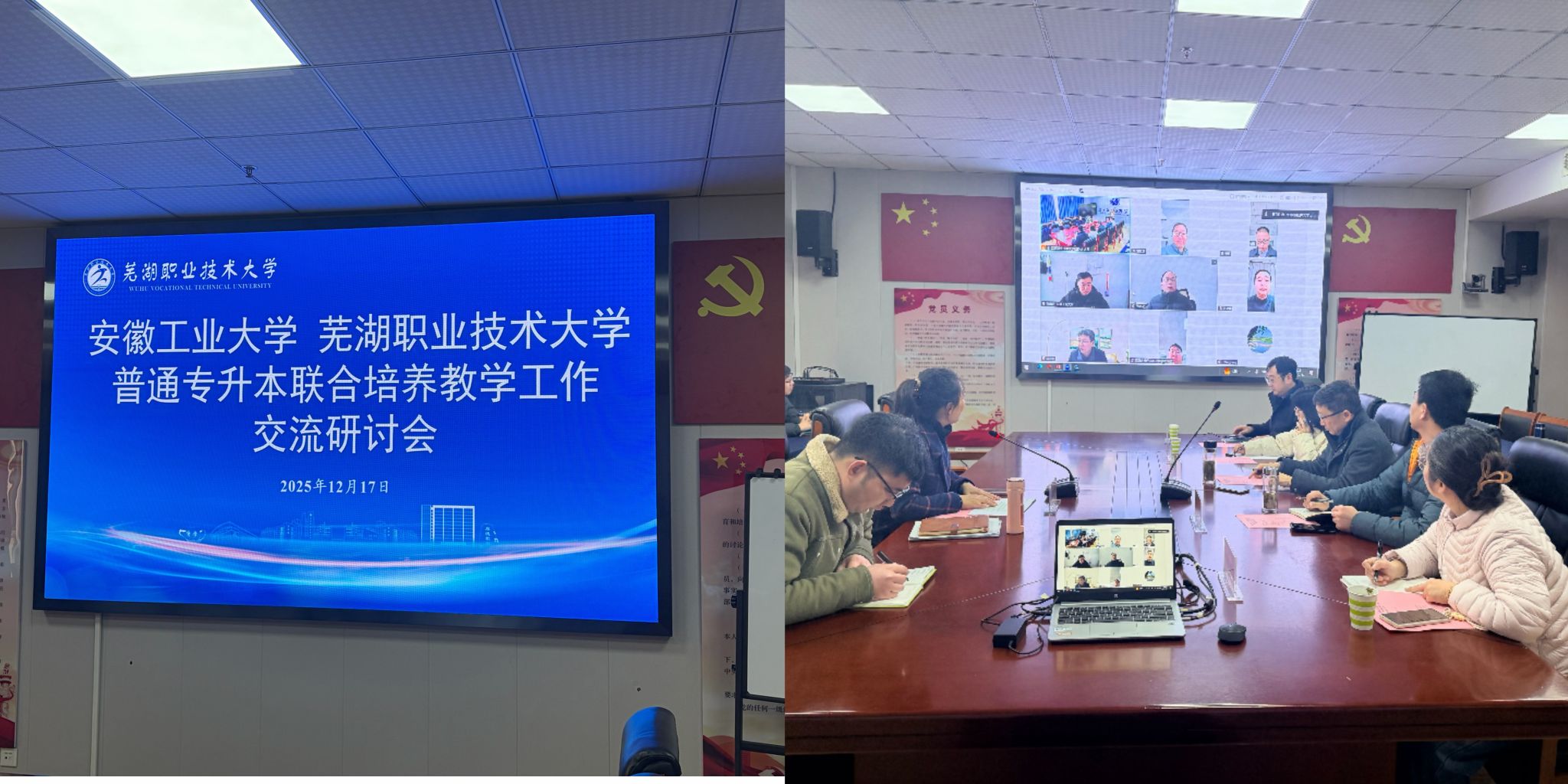 为深化校际协同育人机制,规范普通专升本联合培养各环节管理,切实提升人才培养质量,12月17日,我校与安徽工业大学以线上线下相结合的方式,成功召开2025年普通专升本联合培养工作交流研讨会。安徽工业大学教务处副处长陈德鹏、曹启定,电气与信息工程学院、机械工程学院等相关二级学院教学副院长及教务处实践教学科科长李蒋;我校教务处副处长方君,电气与自动化学院、智能制造学院、经济管理学院、建筑工程学院、国际经贸学院等二级学院副院长、教学秘书、毕业设计对接人及专业负责人参会。会议由我校教务处方君主持。
